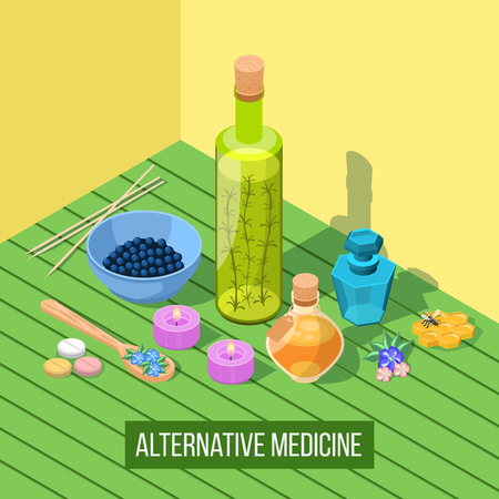 代替医療ホメオパシー アピセラピー鍼植物療法アロマセラピー癒しのベクトル図の要素を持つ等尺性組成物 のイラスト素材 ベクタ Image